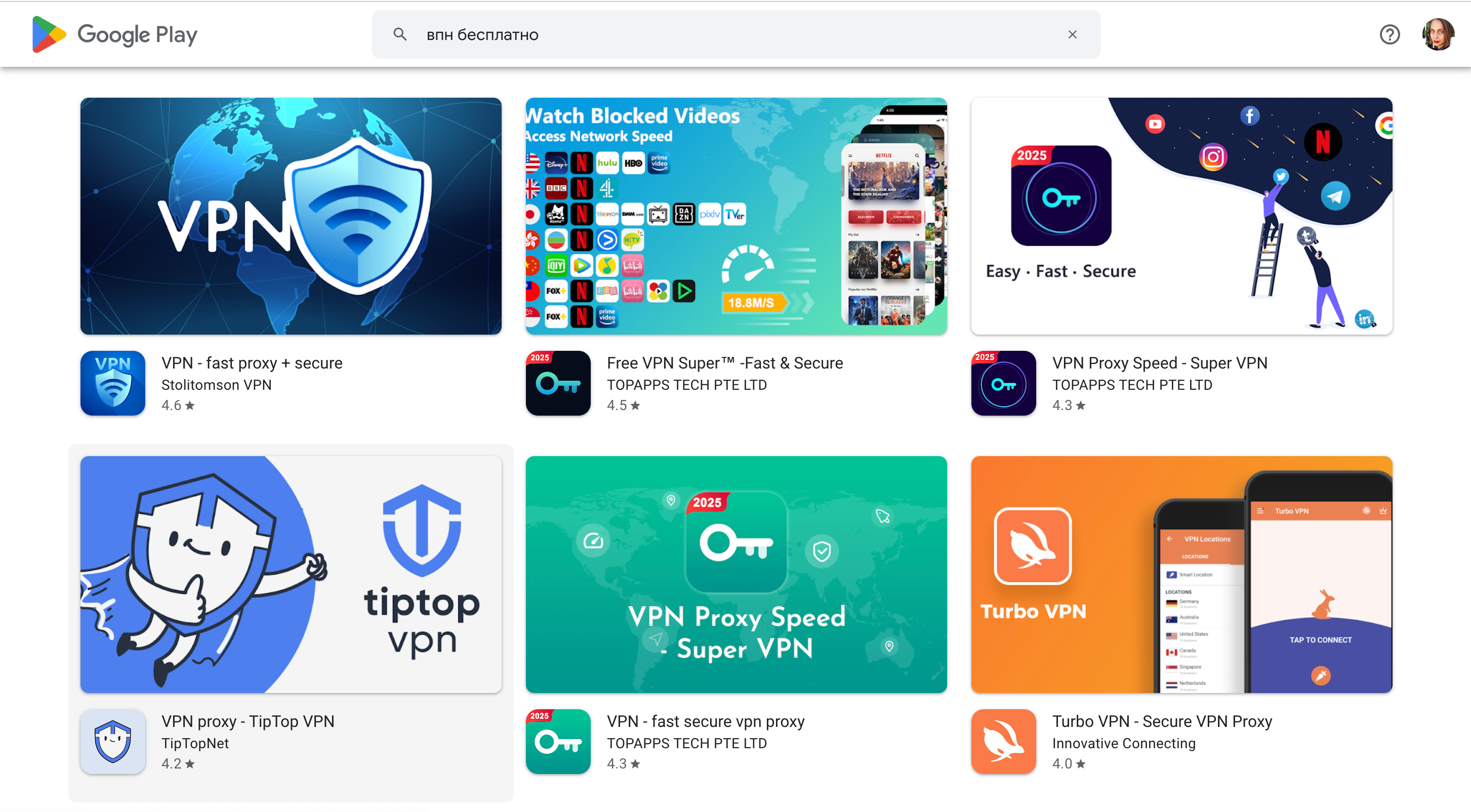Мы включили в обзор 6 сервисов из топа выдачи Google Play по запросу "впн бесплатно":