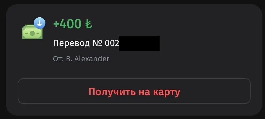 На главном экране появится сообщение, что ваш перевод готов к выдаче. Если вы отправили достаточную сумму, будет доступна кнопка «Получить на карту». Ininal предложит ввести номер карты и выбрать имя и фамилию получателя. Обычно получение происходит мгновенно, в редких случаях оно занимает до 3–5 минут.