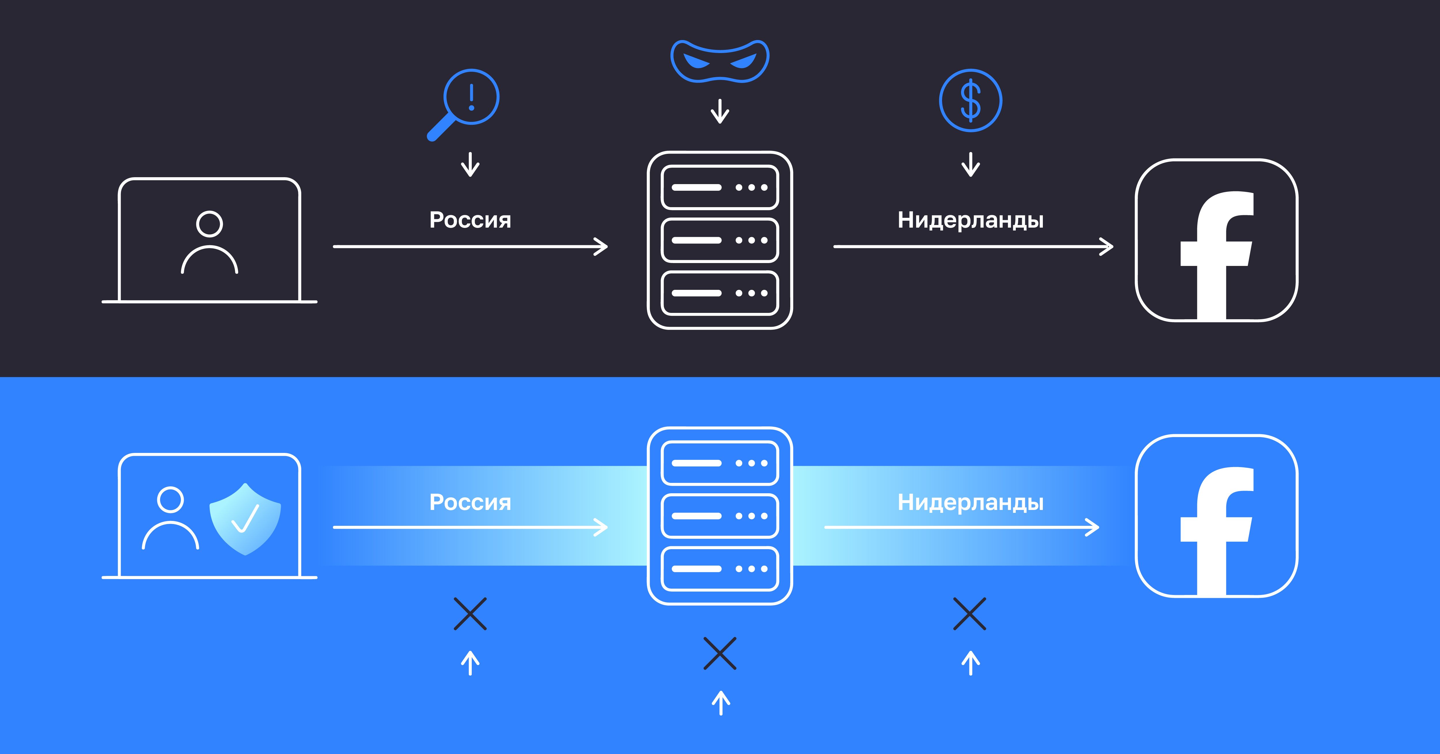 Чтобы зайти в Фейсбук в России или другой стране, где он заблокирован, используйте надежный VPN-сервис. После подключения к серверу за пределами РФ — например в Нидерландах или США — весь трафик шифруется, а внешний IP-адрес меняется на зарубежный. Провайдер видит лишь зашифрованный поток данных, а Фейсбук считает, что пользователь находится в выбранной стране, поэтому без ограничений открывает ленту и Messenger.