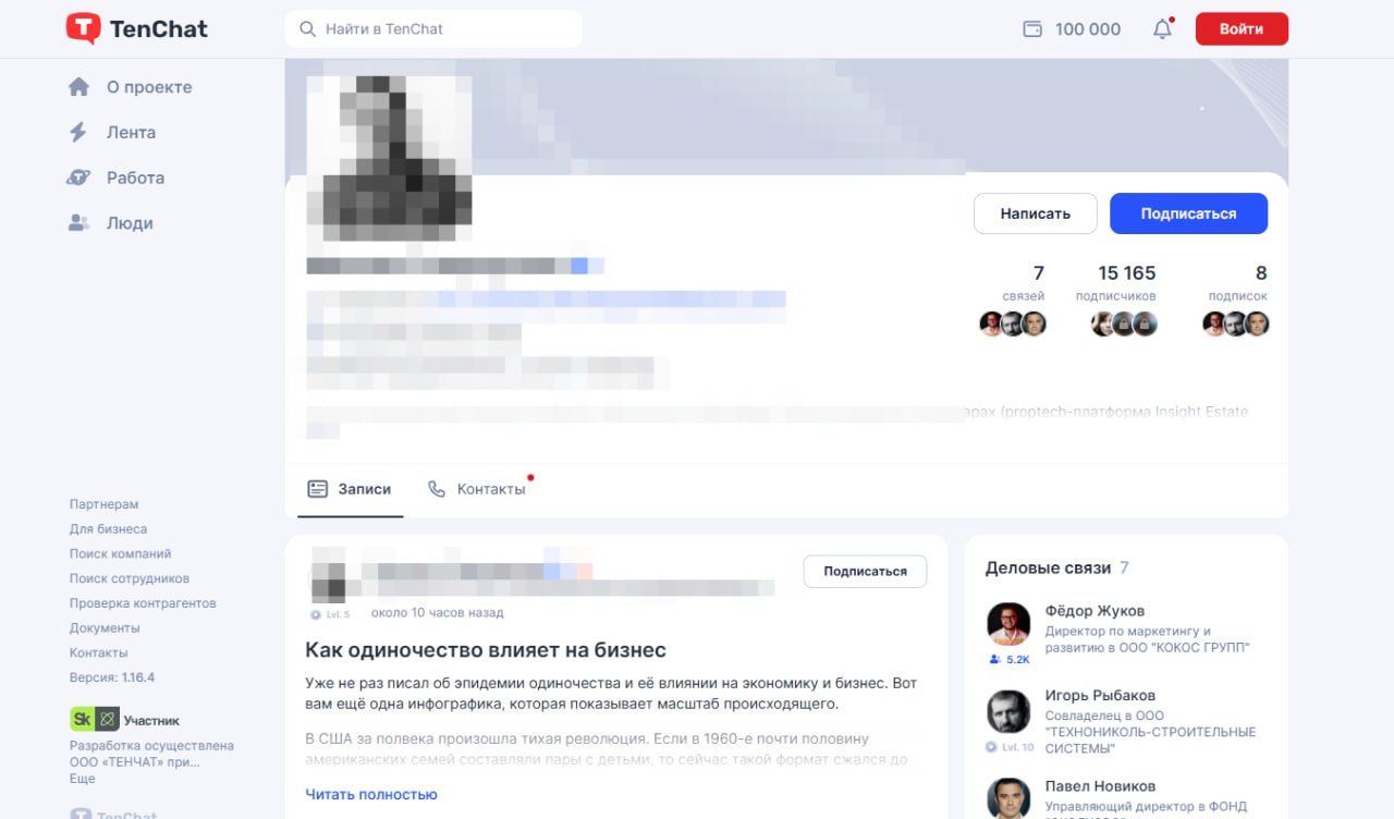 Подходит для тех, кого интересуют в первую очередь деловые контакты. TenChat помогает продвигать свой бизнес, искать партнеров или сотрудников. К началу 2025 года в этой соцсети зарегистрировалось больше пяти миллионов пользователей.