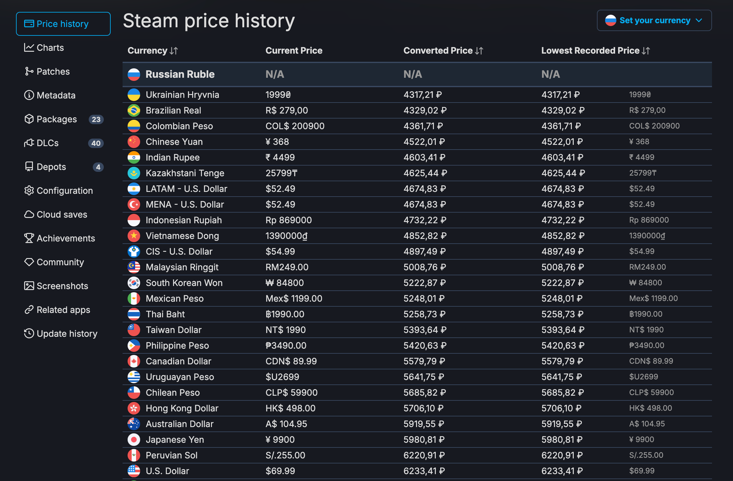Отслеживать региональные цены удобно на SteamDB. Достаточно найти в поиске интересующую игру и выбрать раздел Price History. Сайт выдаст списком цены в странах, где она представлена.