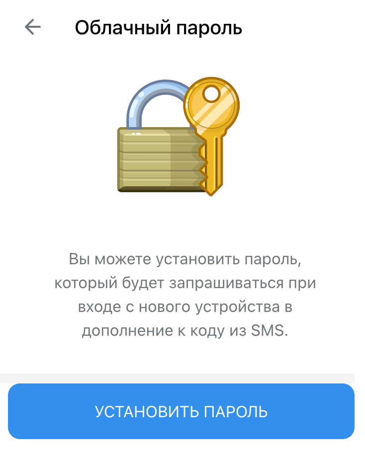 Чтобы в дополнение к коду Телеграм спрашивал пароль, нужно подключить “Облачный пароль”. Это можно сделать в меню “Конфиденциальность”, в разделе “Безопасность”. Выбираем пункт “Облачный пароль”, придумываем уникальную комбинацию и указываем почту для восстановления.