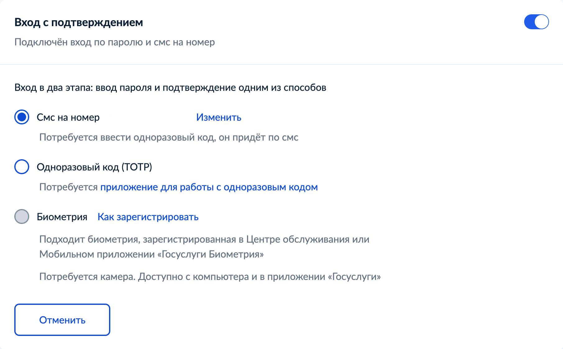 Вход на Госуслуги обязательно происходит в два этапа. Отказаться от второго этапа невозможно, но можно его выбрать: