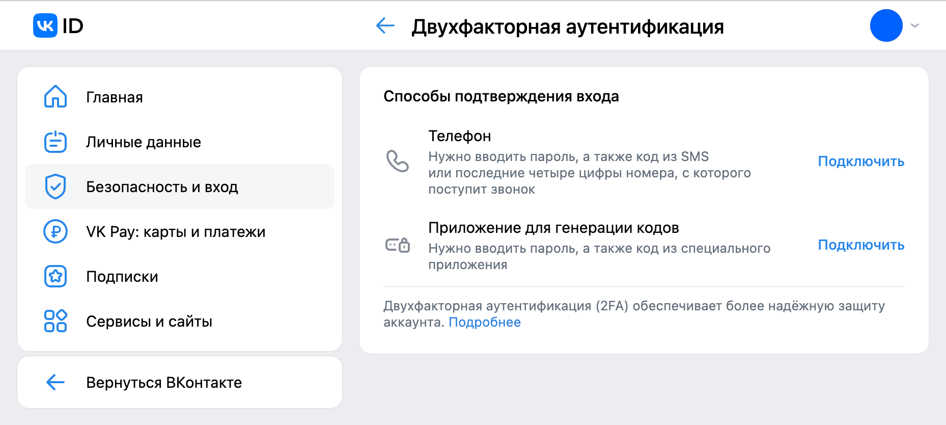 Двухэтапное подтверждение входа в ВК происходит с помощью одноразового кода. Можно выбрать, будет ли это СМС, звонка-сброс или приложение для аутентификации.