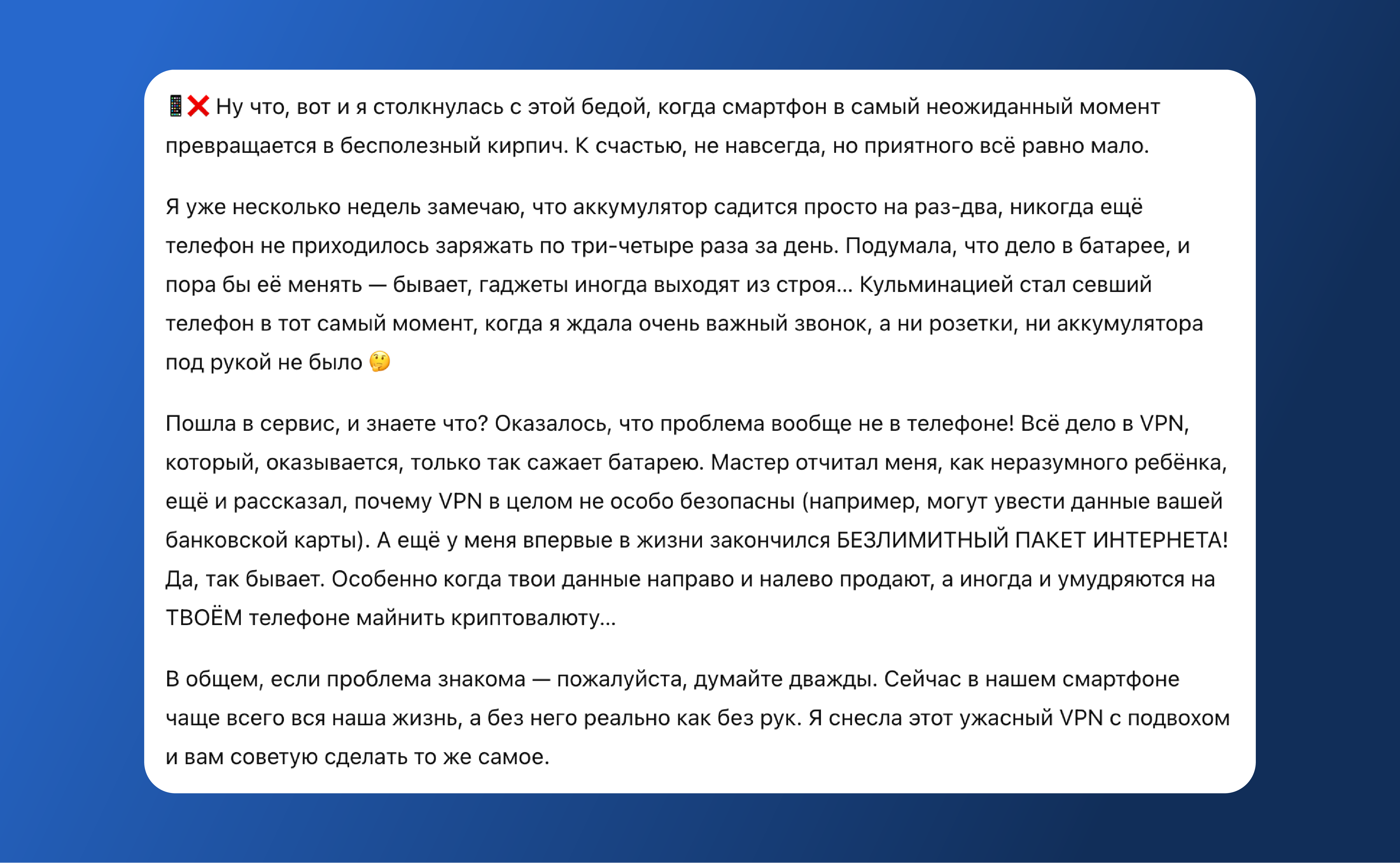 Одно время в различных СМИ и блогах начали появляться сообщения о том, что VPN вредит телефону. Настолько, что его приходится нести в ремонт. Обычно указываются одни и те же проблемы: телефон греется, приложения зависают, расход аккумулятора увеличивается в разы, а вообще через VPN майнят криптовалюту Monero!
